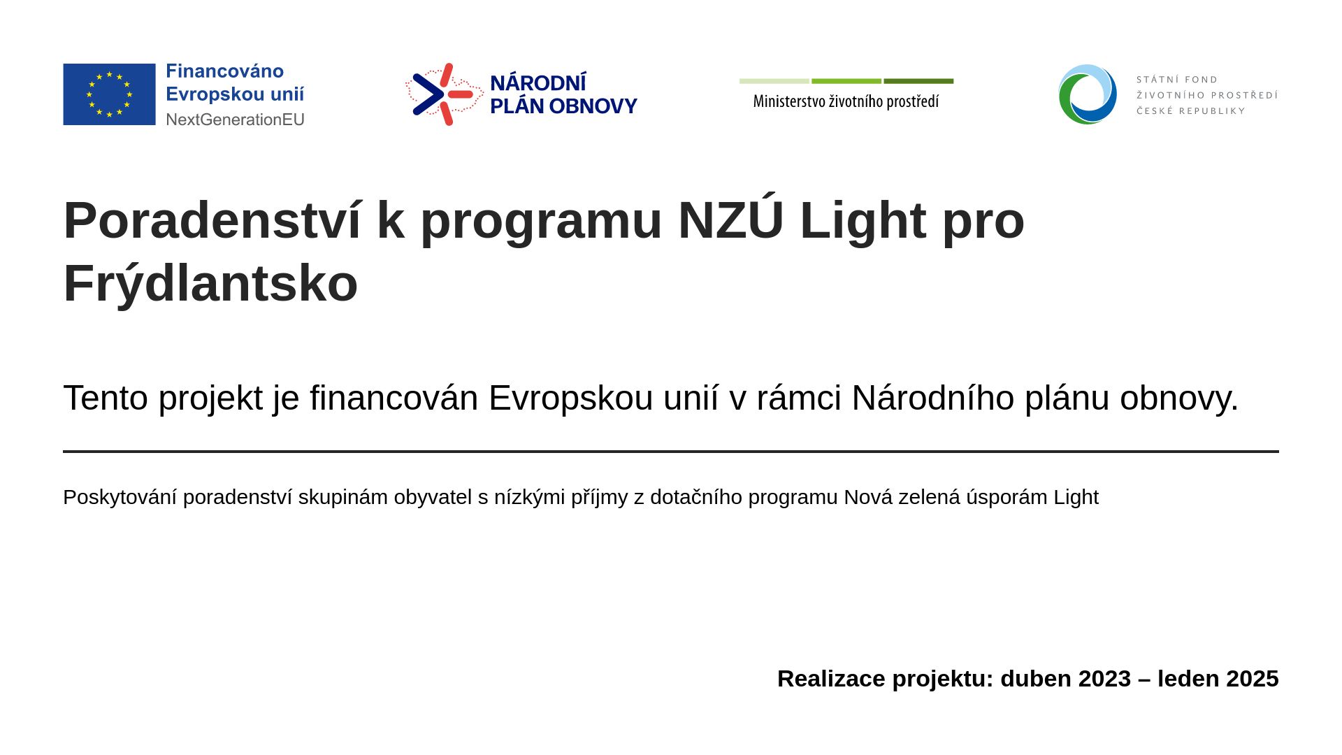 Od ledna 2023 mohou vybrané nízkopříjmové domácnosti získat dotaci na vybraná opatření ke snížení spotřeby energie. MAS Frýdlantsko poskytuje bezplatné konzultace a podporu pro zájemce o tyto dotace. Související provozní náklady MAS financuje s využitím dotace MŽP.