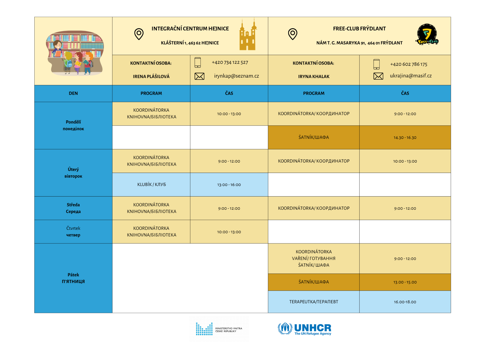 Aktivity probíhají i v tomto školním roce: výuka češtiny ve Free-clubu ve Frýdlantu a nebo v Klášteře v Hejnicích. Petra Krištofová nabízí hodiny doučování online a je možné využít také služeb ukrajinské psycholožky nebo se setkávat při společném vaření.