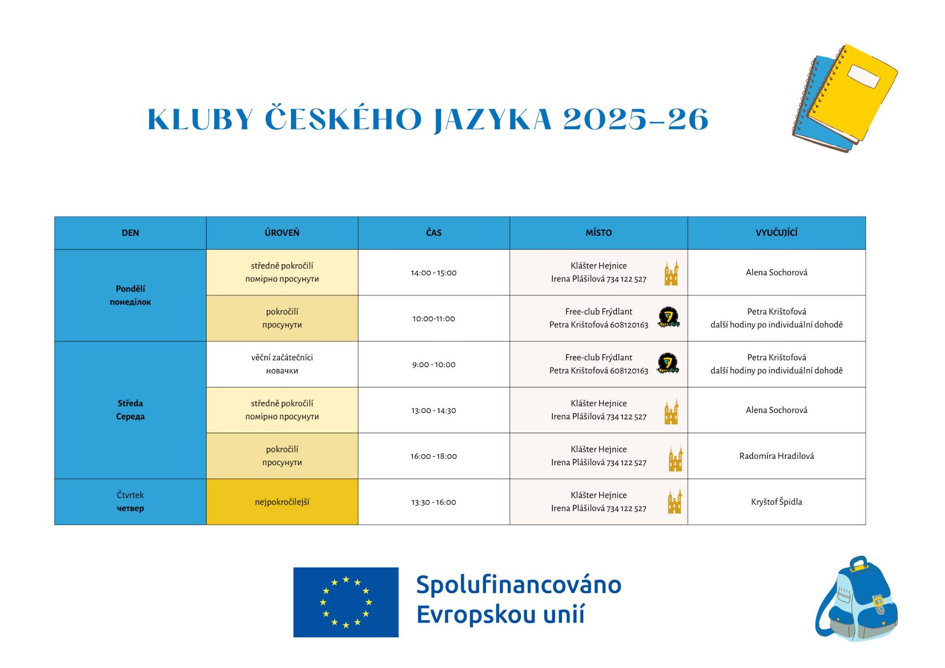 Zde najdete přehled klubů češtiny a komunitních setkávání v roce 2025-26